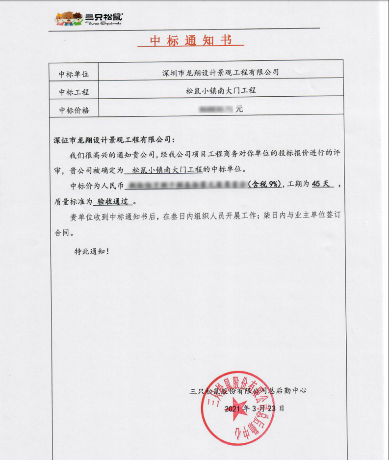 特大喜訊:2021年3月23日,深圳市龍翔設(shè)計景觀工程有限公司(簡稱:龍翔景觀)被三只松鼠股份有限公司確定為松鼠小鎮(zhèn)南大門工程的中標(biāo)單位